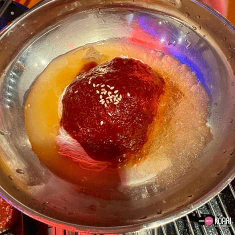 済州スタイル、ぐつぐつ煮立たせたメルチョッ(イワシの塩辛)ソースに、こんがり焼けたお肉を絡めていただきましょう♪