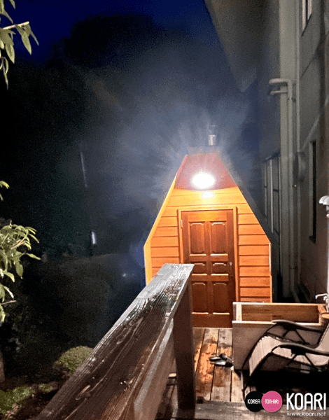初日の夕食ジュースの後、可愛い森のサウナでしっかり汗をかいて都会のけがれ?を流しました。水風呂と大浴場もあるよ。