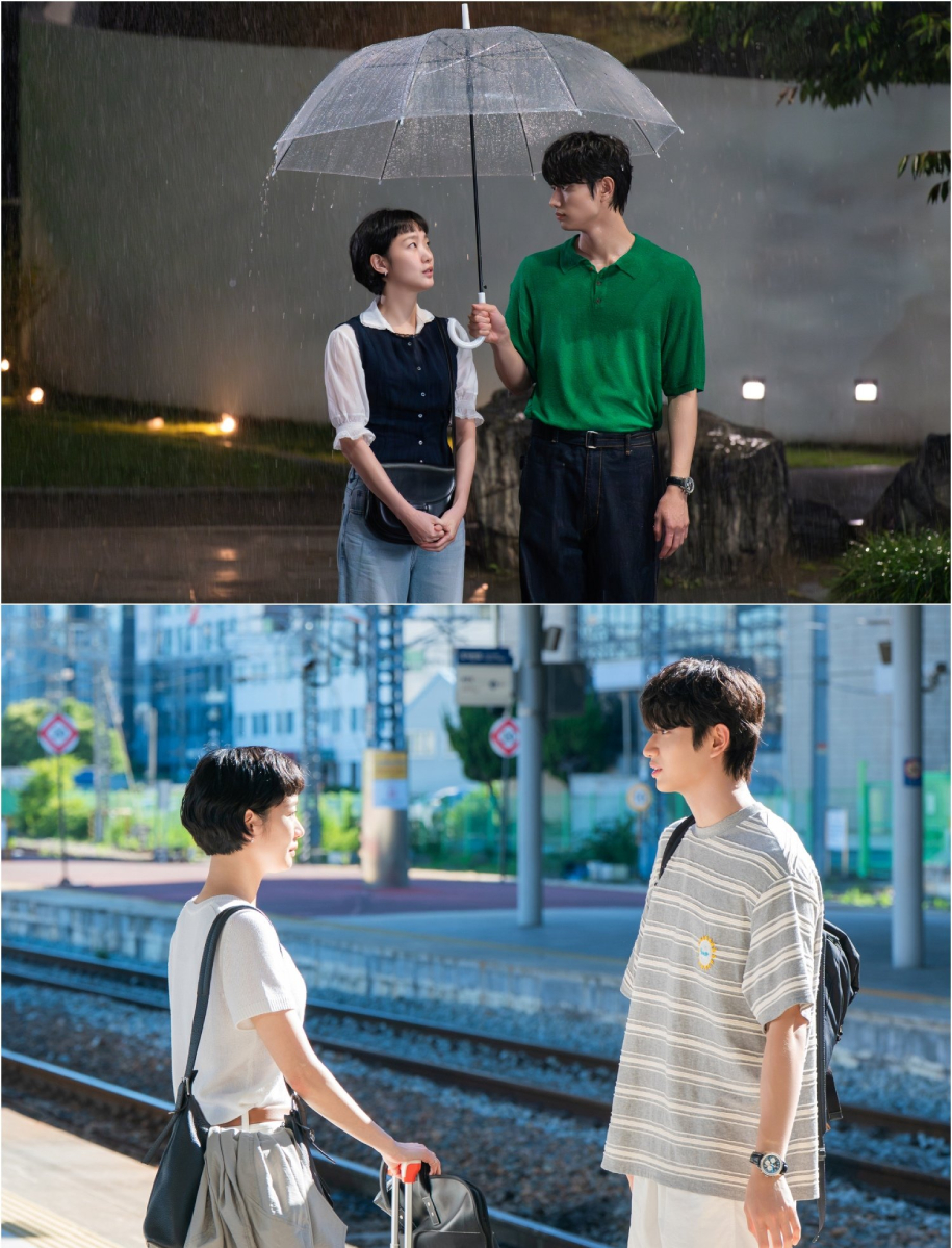 公開されたスチールには、互いを見つめ合うユミとスンロクのときめく瞬間が収められている。雨の中で一本の傘を共有する二人は、ユミの方へ傾いた傘と濡れたスンロクの肩が、妙な緊張感を醸し出している。続いて、陽射しが差し込む線路での視線を交わすシーンも加わり、二人の甘いケミストリーが注目を集めている。